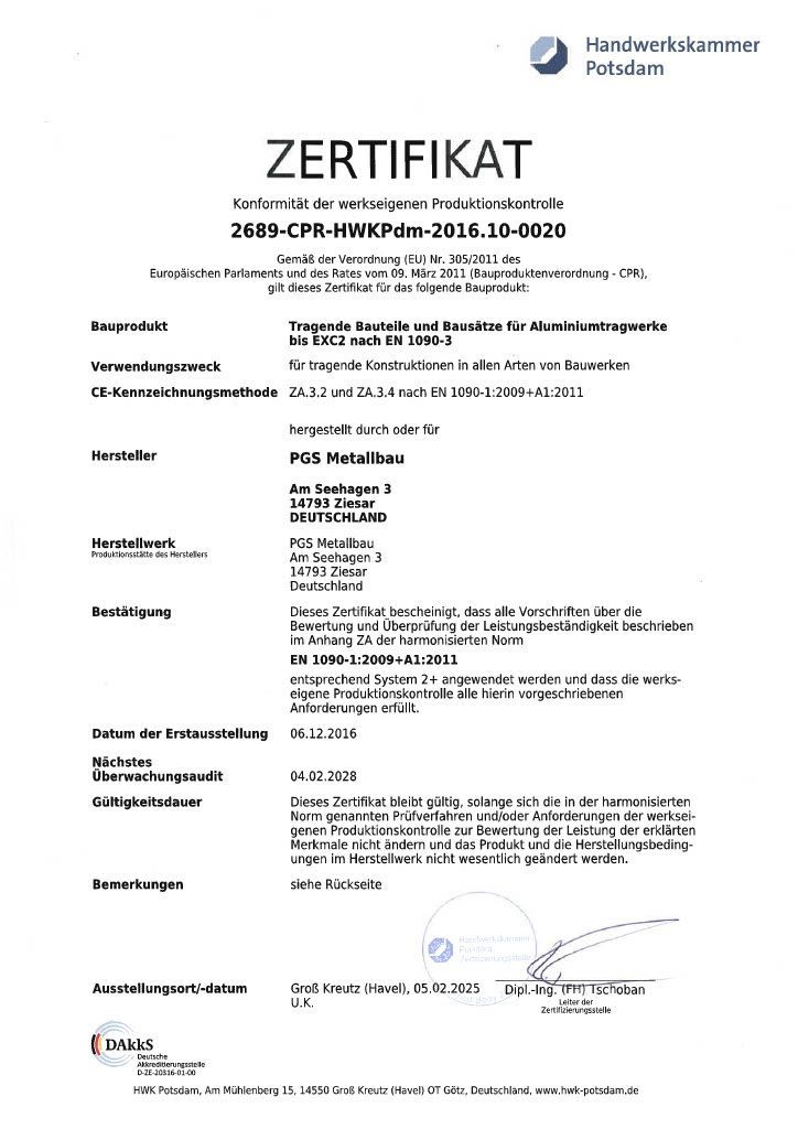 Als Hersteller von Terrassenüberdachungen und Wintergärten sind wir zertifiziert nach DIN EN 1090-3 EXC1 und EXC2.
