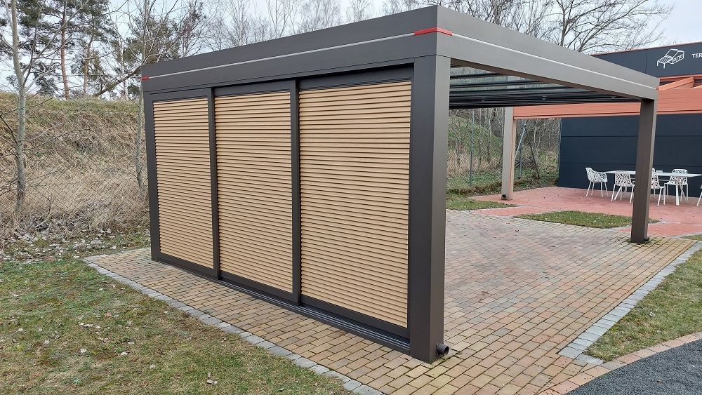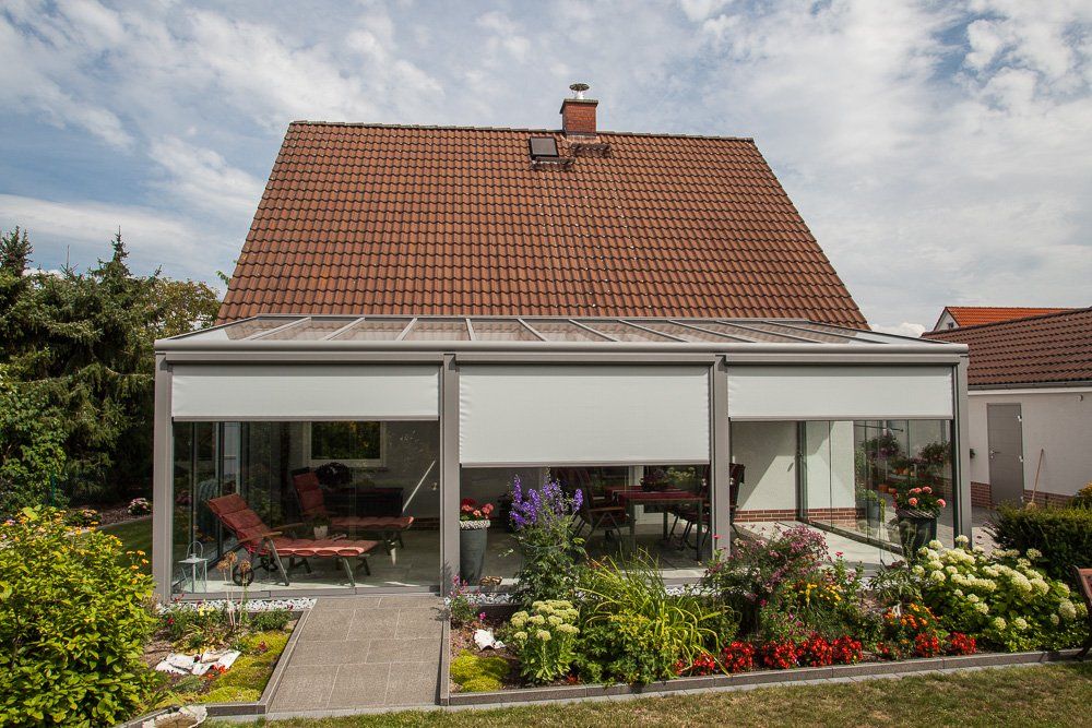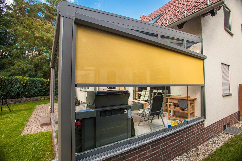 Unter der Rinne und in den Giebelelementen lassen sich Zip-Senkrechtmarkisen integrieren - optisch wie aus einem Guss.