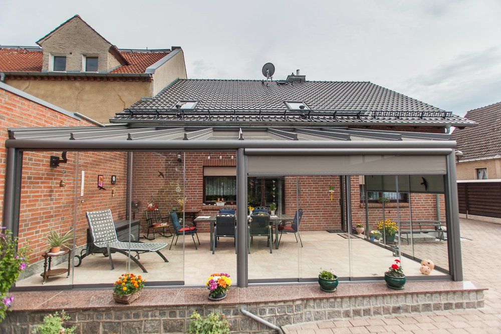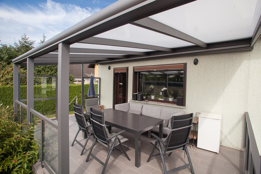 Eindeckung mit Verbundsicherheitsglas oder Stegplatten, integriertes Regenrinnensystem und verdeckt liegende Fallrohre. Wind- und Wetterschutzelemente in vielen Varianten.